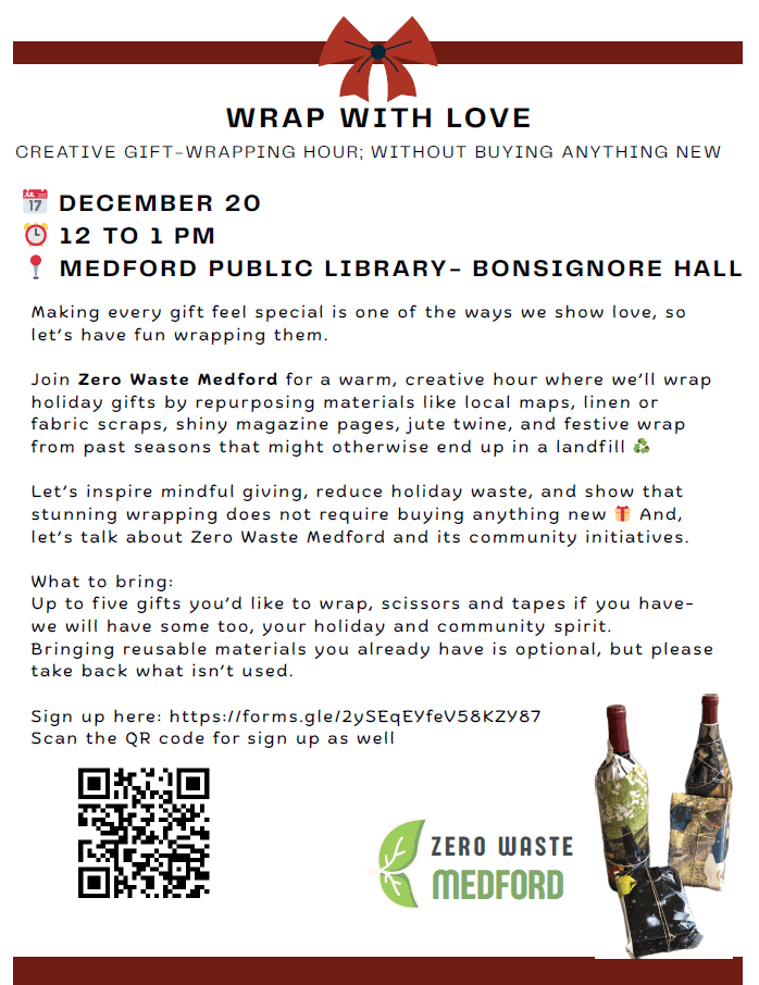 Let’s inspire mindful giving, reduce holiday waste, and show that stunning wrapping does not require buying anything new 🎁 And, let’s talk about Zero Waste Medford and its community initiatives.