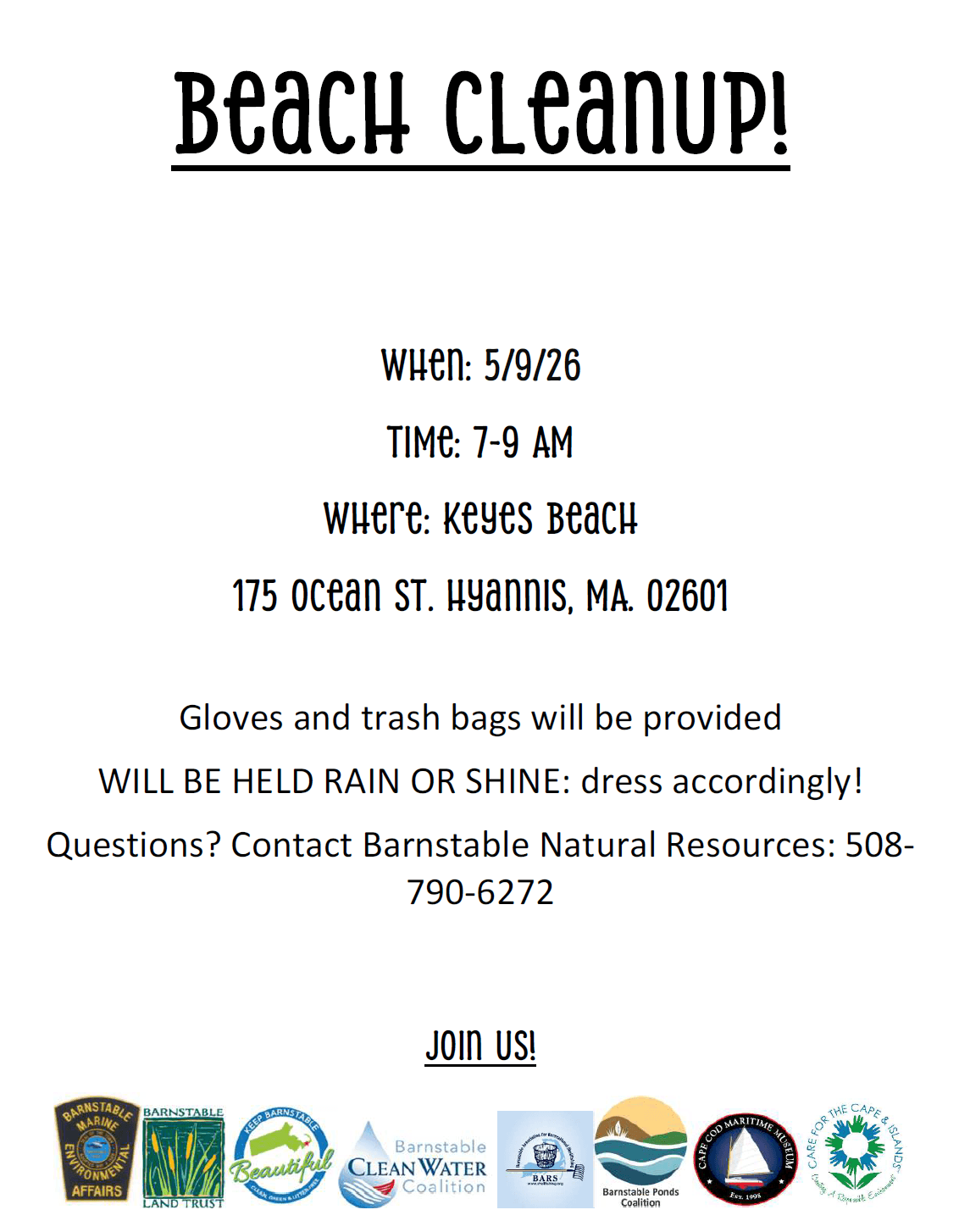 Please join Barnstable Natural Resources and other town organizations to clean Keyes Memorial Beach. Gloves, trash bags, and pickers will be provided. Free, no registration required, and open to the public. Will be held rain or shine so dress accordingly!